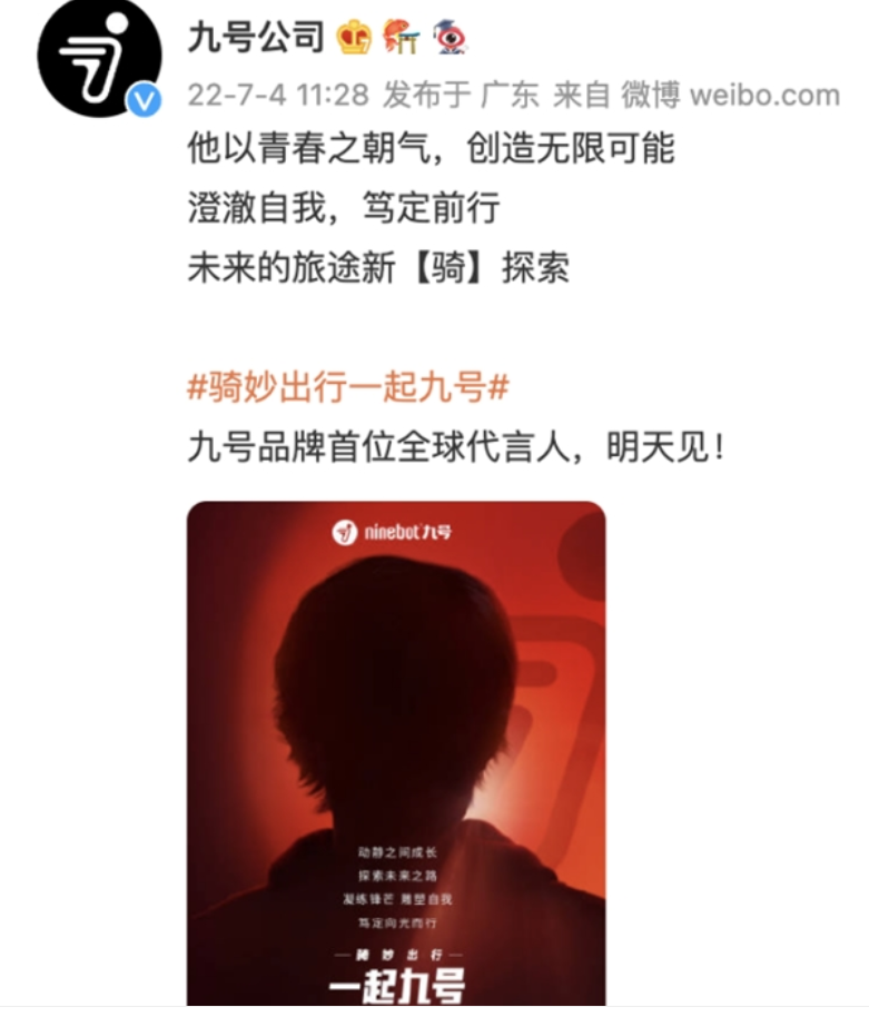 在宣傳視頻中,易烊千璽出鏡,旁白說道:“新的浪潮已經(jīng)到來,讓我們從九號開始,一起集結(jié)、一起開啟、一起創(chuàng)造、一起體驗,一起貼近自然、一起探索潮流,一起“逃離”引力,一起天馬行空,一起去追尋光、去超越光,又或者,成為光。世界新生,未來就緒。讓我們騎妙出行,一起九號。
