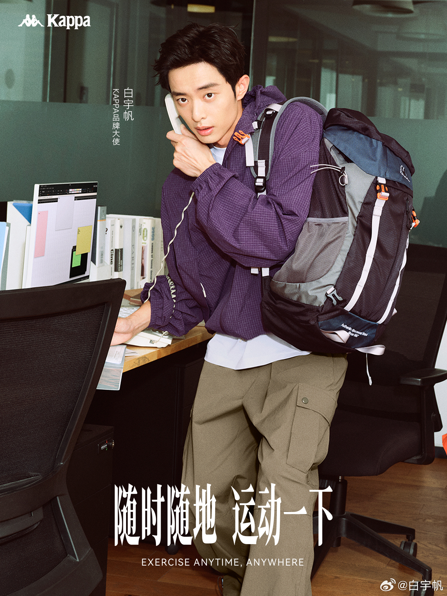 6 月 10 日,Kappa 官宣演員白宇帆(明星經(jīng)紀(jì)公司)為品牌大使,并釋出以「隨時(shí)隨地,運(yùn)動(dòng)一下」為主題的系列大片,向消費(fèi)者傳遞品牌的自由運(yùn)動(dòng)理念。Kappa 認(rèn)為生活中處處蘊(yùn)含運(yùn)動(dòng)哲學(xué),職場(chǎng)、停車場(chǎng)、菜市場(chǎng),都可以成為你的運(yùn)動(dòng)場(chǎng)域,運(yùn)動(dòng),最重要的是動(dòng)起來。
