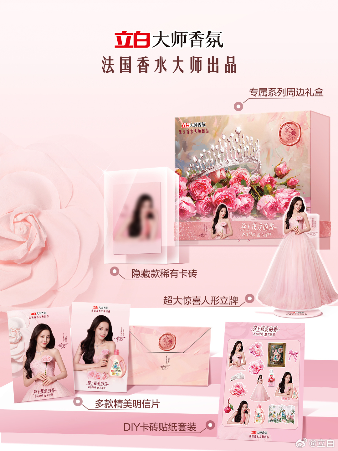 不僅如此,立白還推出了代言人系列的「香與時尚小粉盒」,內含隱藏款卡磚、人形立牌、明信片以及DIY卡磚貼紙,吸引粉絲群體。同時,還邀請粉絲用戶進入直播間參與互動,贏取周邊福利。