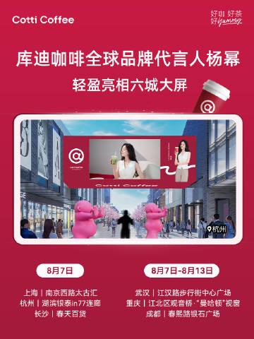 8 月 7 日起,代言人咖茶生活大片也將輕盈亮相上海、杭州、長沙、武漢、成都、重慶六城商圈大屏,供粉絲六城尋「冪」。打卡代言人大屏有機(jī)會(huì)獲得咖啡飲品券。
