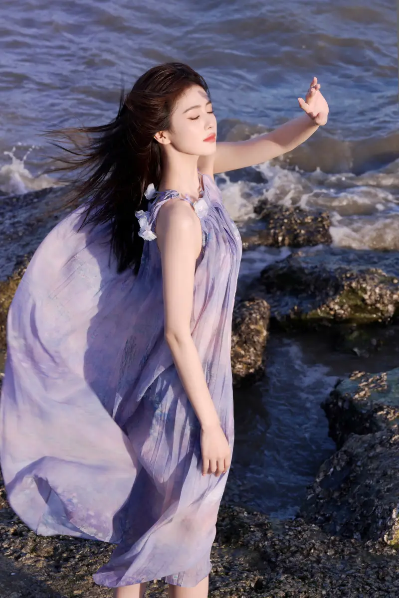 白鹿穿紫色紗裙海邊漫步 側(cè)身燦笑明媚如陽光