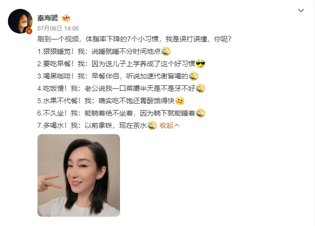 7月6日,秦海璐(明星經(jīng)紀(jì)公司)在個(gè)人社交賬號(hào)發(fā)文,分享了自己體脂率下降的幾個(gè)小習(xí)慣,順便談及了一些家庭生活,秦海璐表示因?yàn)橐蛢鹤由蠈W(xué),所以養(yǎng)成了吃早餐的習(xí)慣,她還笑稱因?yàn)槌圆讼矚g細(xì)嚼慢咽,還被老公誤以為是不是牙口不好。