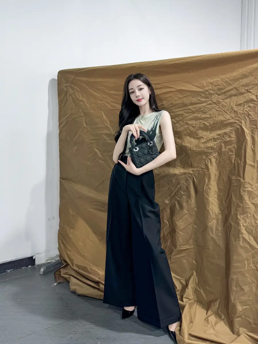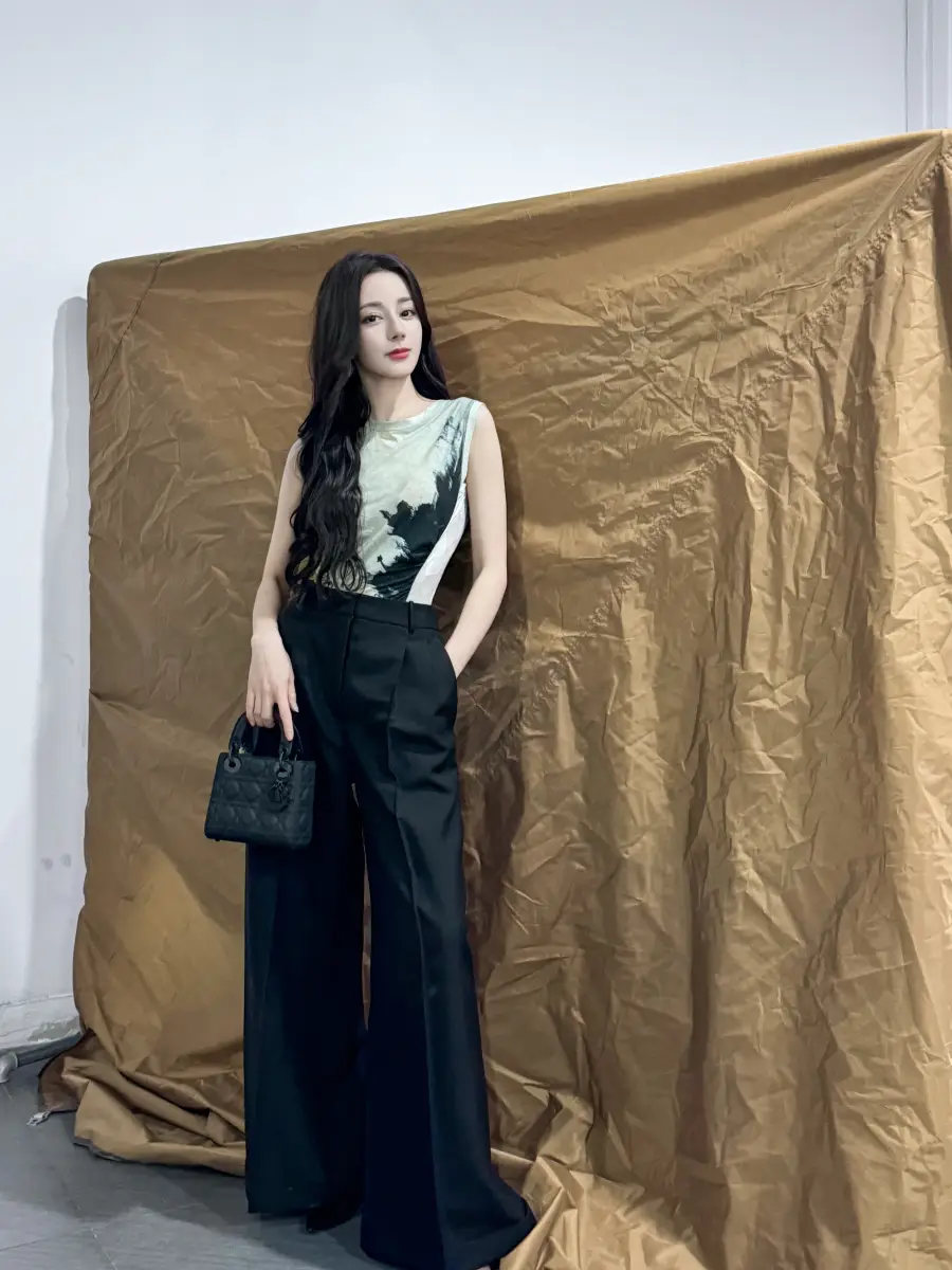 迪麗熱巴穿露肩緊身衣,搭配闊腿褲,妝容精致五官絕美!