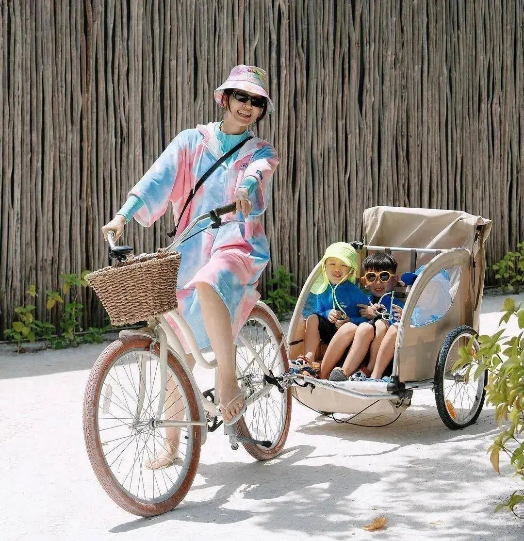 除了下海游泳,他們一家五口還在沙灘騎車,胡杏兒和老公負(fù)責(zé)當(dāng)車夫,三個兒子坐在后面,畫面非常溫馨。