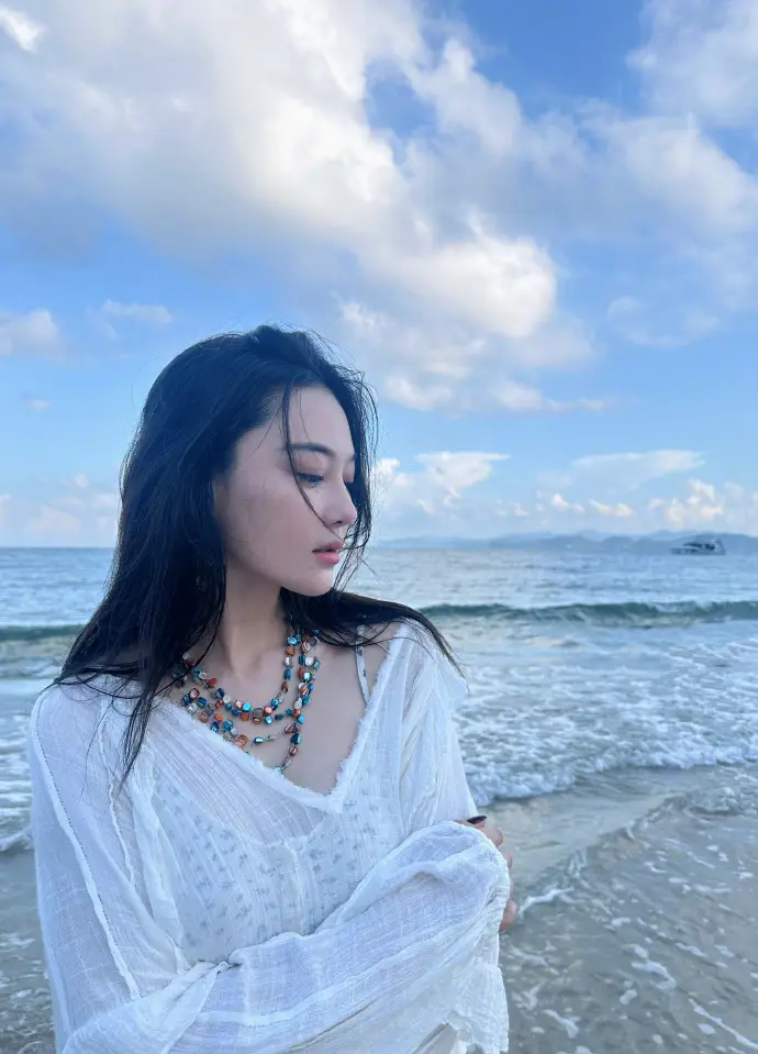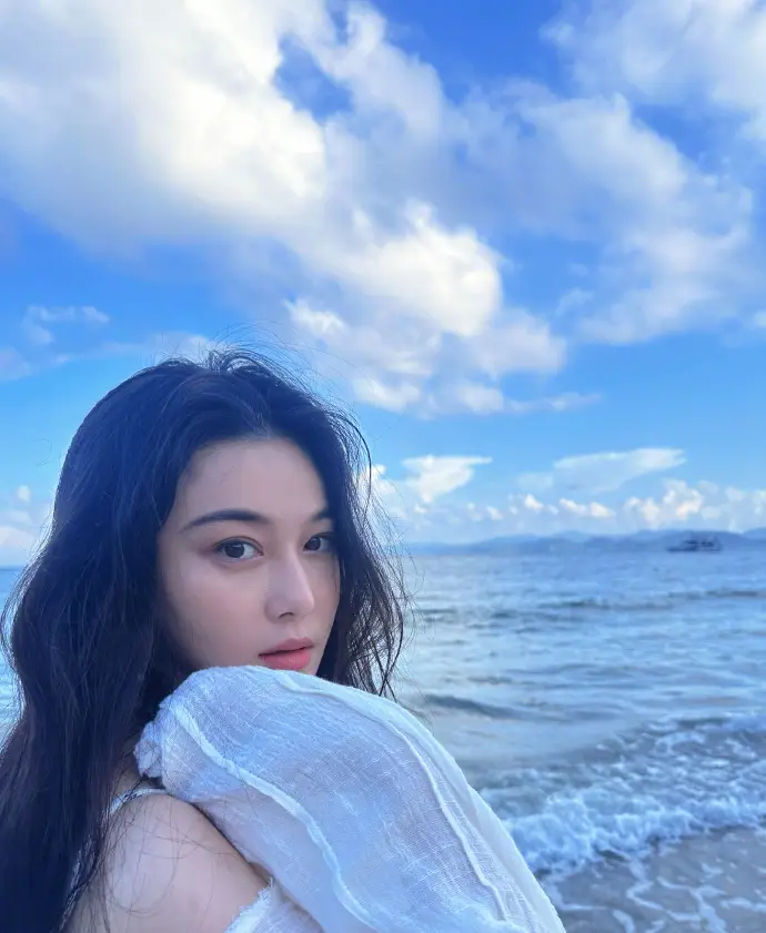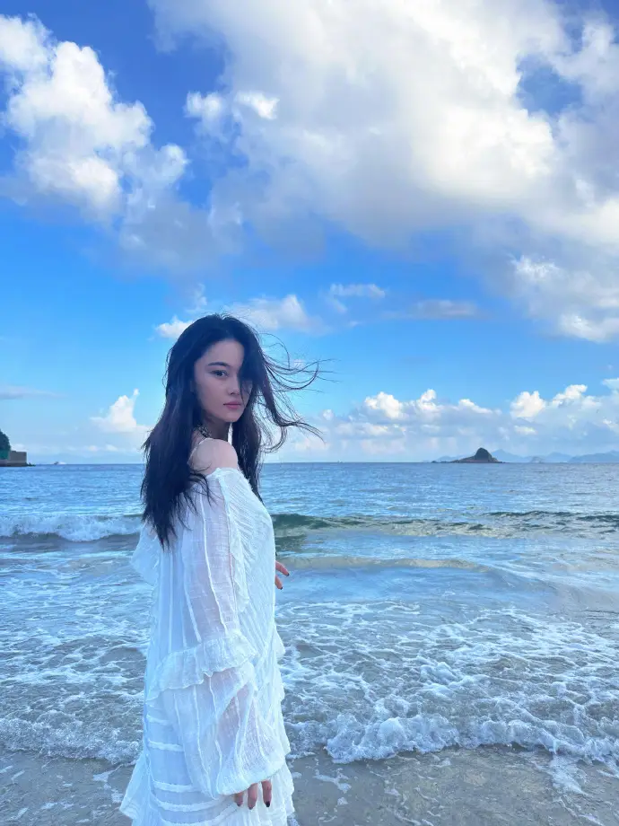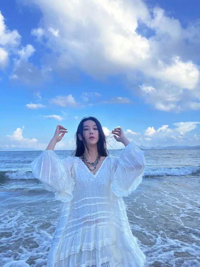 張馨予海邊回眸美艷大方 一身白衣清純動人