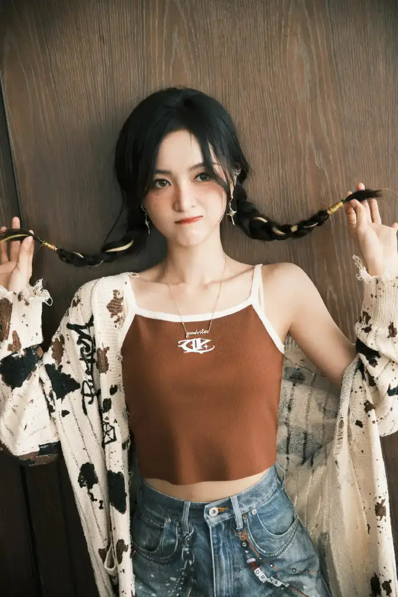 吳宣儀穿棕色吊帶嘟嘴賣萌可愛十足 搭配麻花辮造型鬼馬俏皮