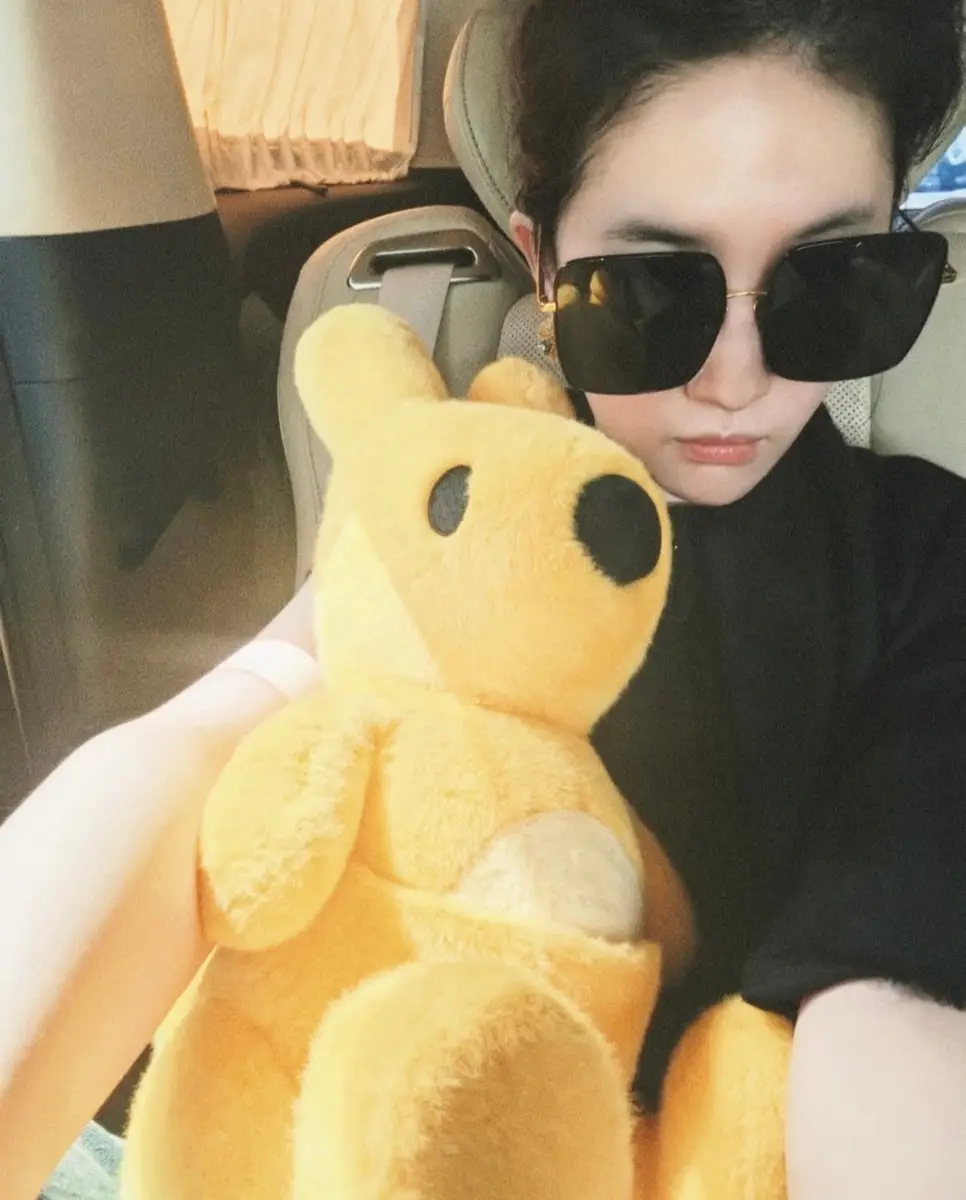 劉亦菲戴著墨鏡,抱著玩偶自拍。