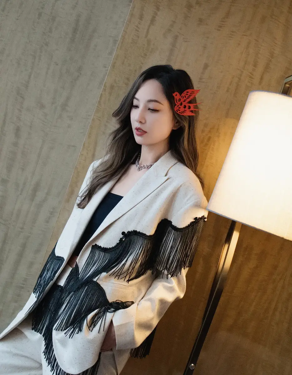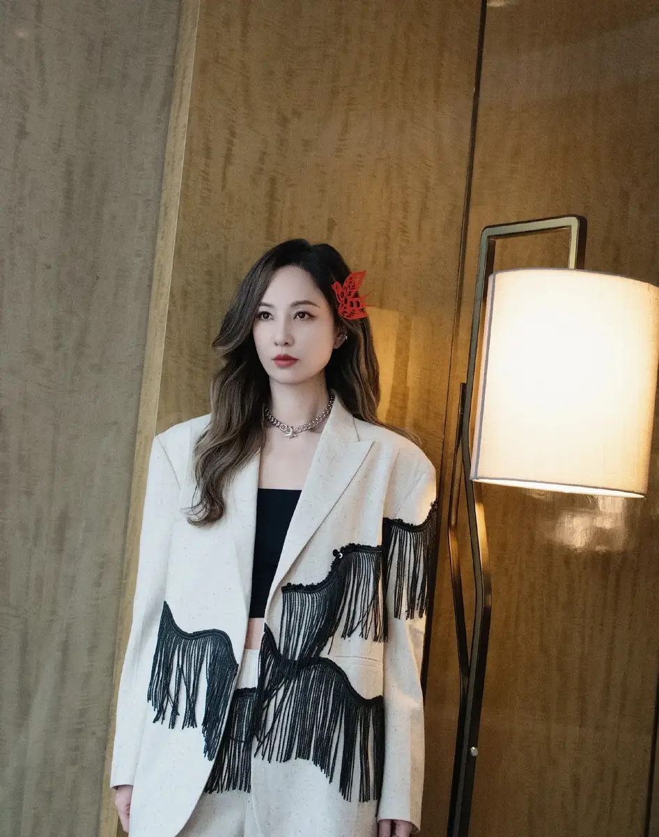 鄭希怡穿搭時(shí)髦,很有特點(diǎn)。