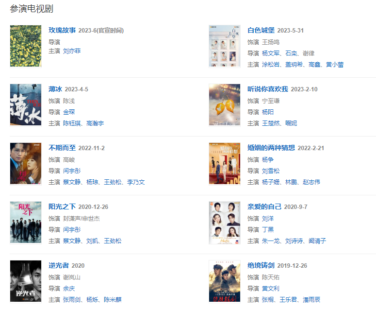 2023年2月10日,主演的電視劇《聽說你喜歡我》開播;4月5日,主演的電視劇《薄冰》開播;5月31日,主演的電視劇《白色城堡》開播。 8月5日,主演的電視劇《但愿人長久》在騰訊視頻播出。