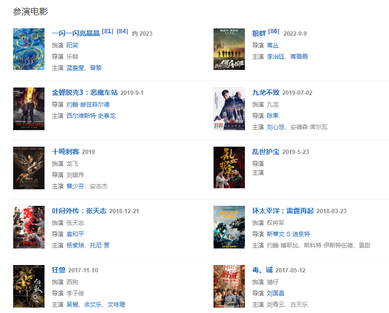 代表作品:殺破狼2、葉問3、一代宗師、澳門風云、水月洞天、靈鏡傳奇