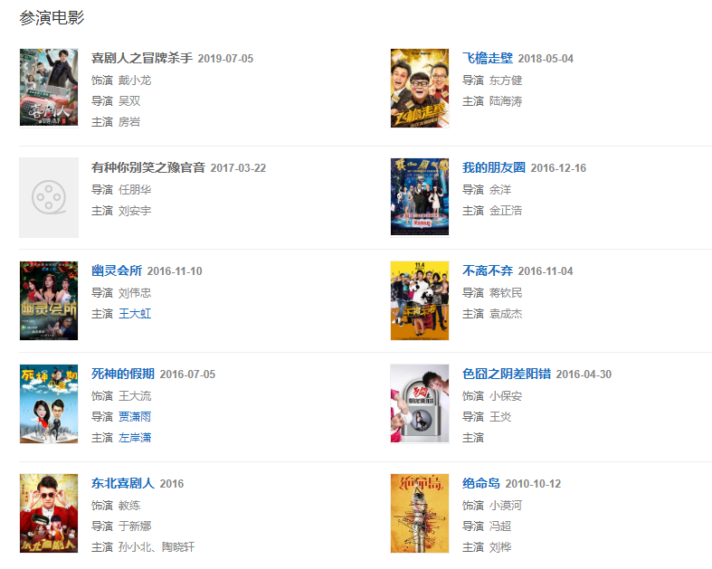 代表作品:夢想劇場、色囧之陰差陽錯、笑嗷喜劇人、飛檐走壁、楊光的新生活、老兵