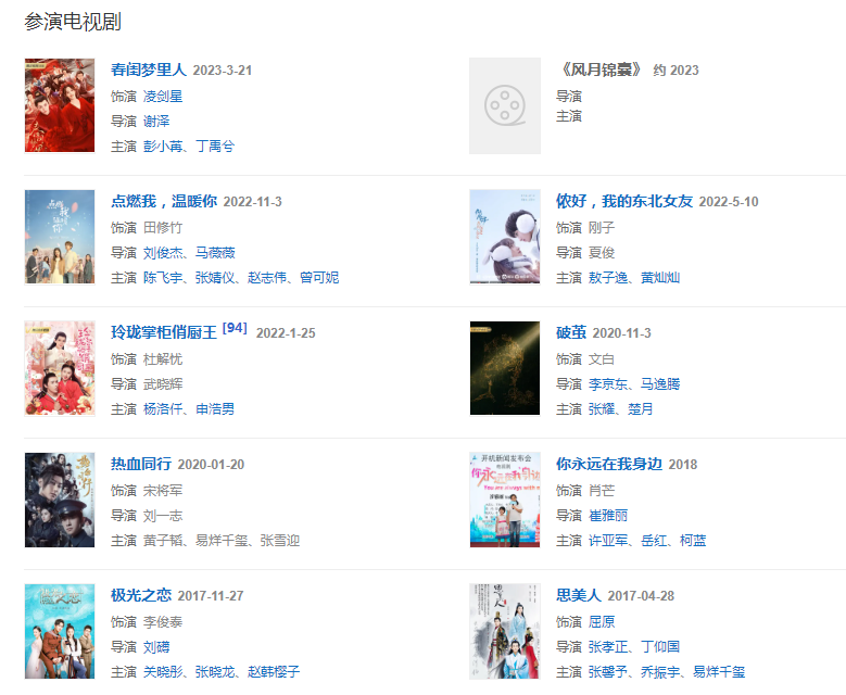代表作品:花千骨、重生之名流巨星、麻辣變形計、思美人、極光之戀、新龍門客棧