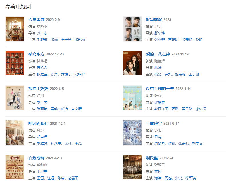 代表作品:一代梟雄、那年花開月正圓、親愛的,熱愛的、三十而已、鬢邊不是海棠紅、驪歌行、千古玦塵、愛的二八定律