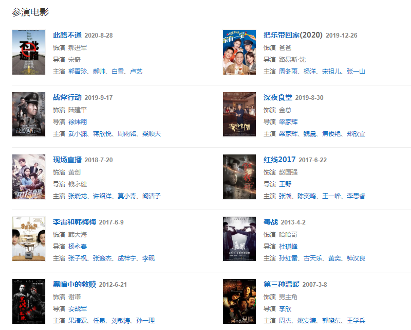 2020年2月21日,參演的都市劇《安家》播出;5月31日,與陳建斌、董勇合作主演的電視劇《三叉戟》在浙江衛(wèi)視、江蘇衛(wèi)視同步播出;11月5日,特別出演的青春勵志公安劇《以父之名》登陸騰訊視頻全網(wǎng)獨(dú)播執(zhí)導(dǎo);11月,領(lǐng)銜主演的刑偵題材電視劇《復(fù)古神探》在重慶開機(jī);同年,參與大型文化節(jié)目《故事里的中國》第二季。