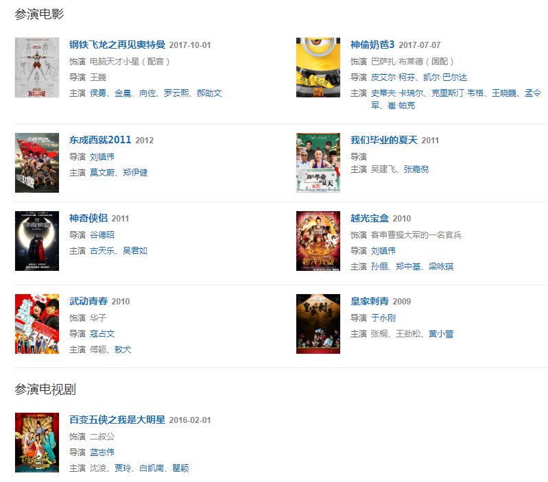 2017年首次參與影視配音,獻聲《神偷奶爸3》中的大反派巴薩扎·布萊德。