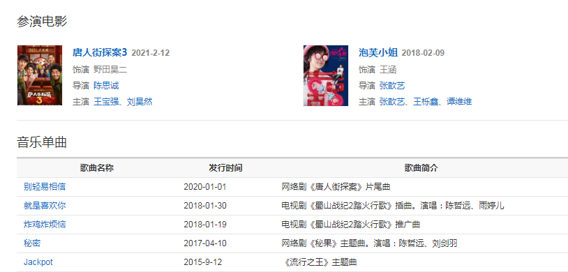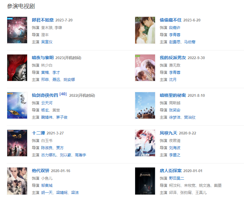 代表作品:絕代雙驕、暗格里的秘密、唐人街探案3、郎君不如意、仙劍奇?zhèn)b傳四