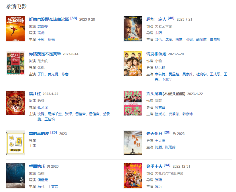 2023年1月22日,特別出演的電影《滿江紅》上映 ;同日,參演的合家歡喜劇《抬頭見喜》上映。 2023年1月23日(大年初二),特別出演的電影《東北戀哥2》上映 。