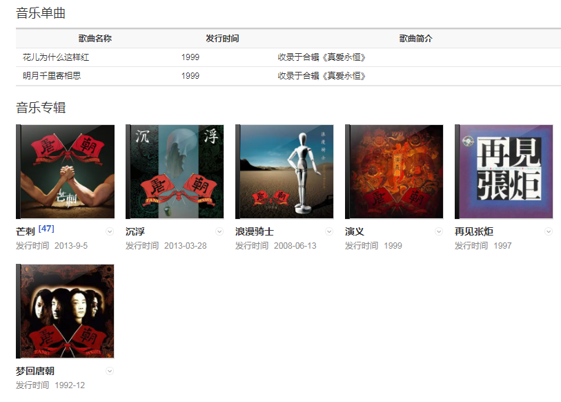 1988年,唐朝樂(lè)隊(duì)初創(chuàng)。1990年,參加北京首都體育館“90現(xiàn)代音樂(lè)會(huì)”。1991年5月,簽約臺(tái)灣魔巖唱片公司。1992年12月,發(fā)行首張專輯《夢(mèng)回唐朝》。1994年12月17日,在香港紅磡體育館參加“搖滾中國(guó)樂(lè)勢(shì)力演唱會(huì)”。1997年12月,參加北京音樂(lè)臺(tái)“搖滾之夜演唱會(huì)”。1999年,發(fā)行專輯《演義》。2003年12月13日,擔(dān)任二手玫瑰樂(lè)隊(duì)“通天演唱會(huì)”嘉賓。2006年6月16日,在沈陽(yáng)參加“紀(jì)念中國(guó)搖滾20年演唱會(huì)”。2008年6月13日,發(fā)行專輯《浪漫騎士》。