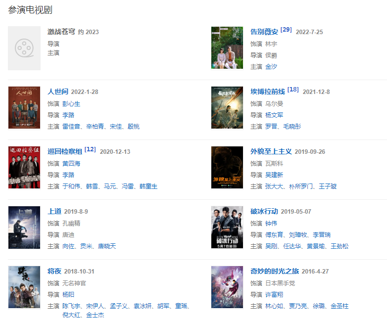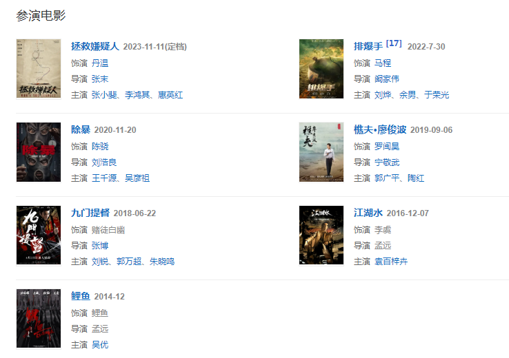 2014年,主演微電影《鯉魚(yú)》,從而正式進(jìn)入影視圈 。2016年4月,參演的都市穿越劇《奇妙的時(shí)光之旅》開(kāi)播;8月,參演都市愛(ài)情劇《北京遇上西雅圖》;12月,主演的現(xiàn)代動(dòng)作電影《江湖水》上線。 。2018年,主演的網(wǎng)絡(luò)電影《九門(mén)提督》上線 。2019年,參演的緝毒題材懸疑刑偵劇《破冰行動(dòng)》播出,在劇中飾演鐘偉;8月9日,主演的硬核熱血?jiǎng) 渡系馈凡コ?;9月6日,主演的人物傳記影片《樵夫·廖俊波》在全國(guó)上映;9月26日,主演的青春校園劇《外貌至上主義》播出。202011月20日,主演犯罪題材電影《除暴》上映;12月13日,參演的檢察法治劇《巡回檢察組》開(kāi)播,飾演黃四海。2021年,參演電視劇《埃博拉前線》 ;同年,主演軍旅題材電影《排爆手》。2022年,主演由茅盾文學(xué)獎(jiǎng)獲獎(jiǎng)作品改編的現(xiàn)實(shí)題材巨作電視劇《人世間》 ;5月,主演張末執(zhí)導(dǎo)的電影《拯救嫌疑人》正式開(kāi)機(jī) ;同年10月,由洪浚嘉領(lǐng)銜主演的網(wǎng)劇《告別薇安》在騰訊視頻播出 。