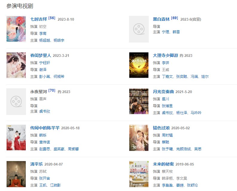 2023年3月,主演的古裝輕喜愛情劇《春閨夢(mèng)里人》播出;8月,主演的甜虐仙戀輕喜劇《七時(shí)吉祥》播出。