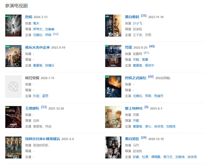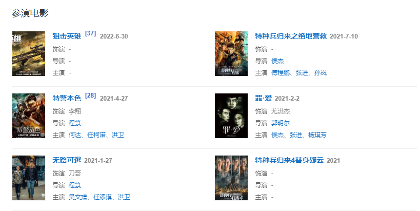 2010年開始相繼參演劉猛執(zhí)導的軍旅劇《我是特種兵》、《我是特種兵之利刃出鞘》和《特種兵之火鳳凰》,為觀眾所熟知。