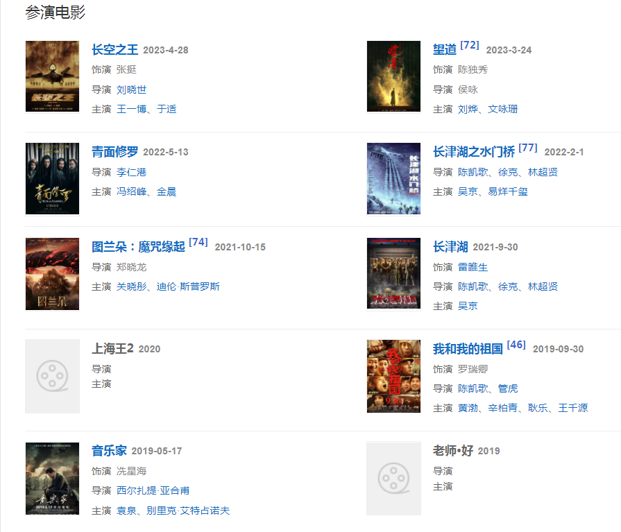 代表作品:藍(lán)宇、天龍八部、金婚風(fēng)雨情、赤壁、十月圍城、好奇害死貓、于無聲處