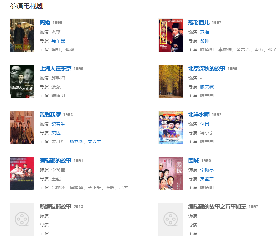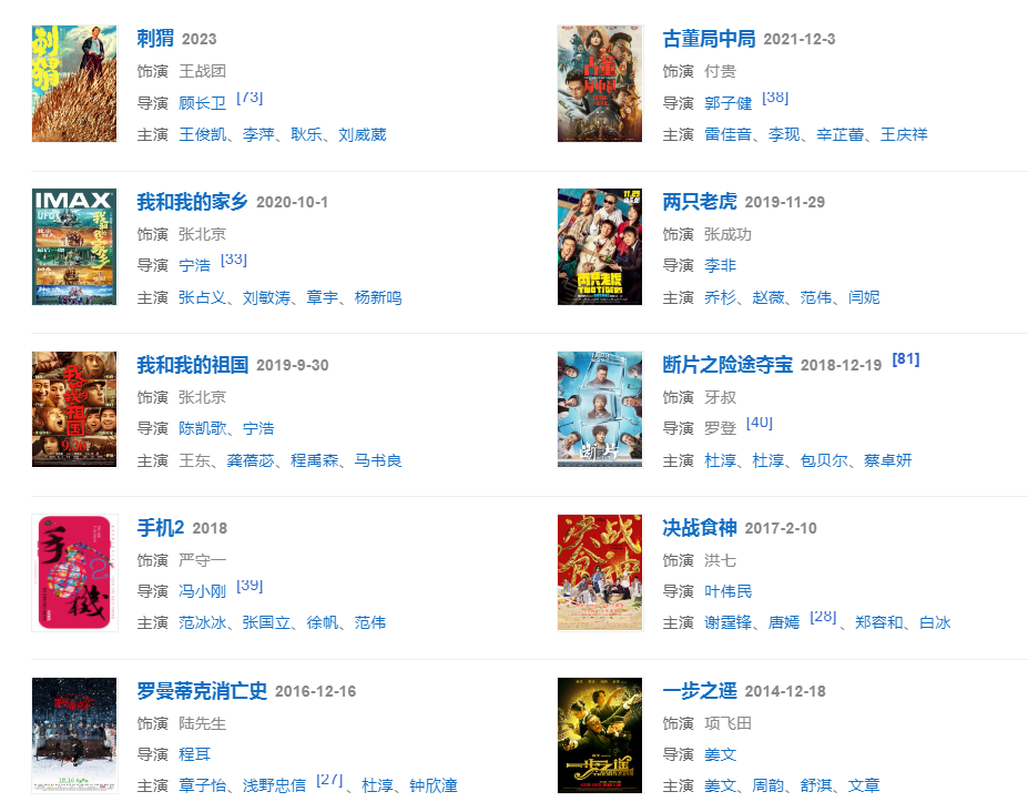 代表作品:編輯部的故事、活著、甲方乙方、不見不散、沒完沒了、大腕、手機、夜宴、非誠勿擾、讓子彈飛