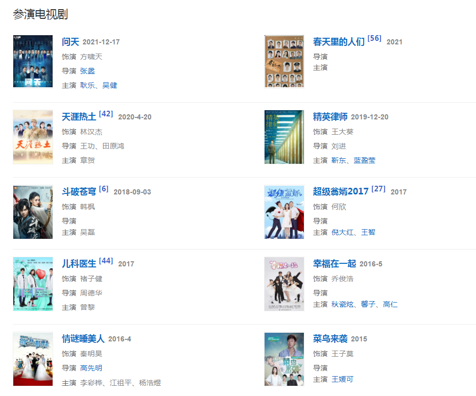 2021年11月6日,與李曉峰主演的電視劇《春天里的人們》在央視八套播出 ;12月2日,與姜超主演的國產(chǎn)科幻災(zāi)難電影《末日救援》在騰訊視頻獨家上映;12月17日,與何雨晴等主演的新時代航天事業(yè)電視劇《問天》在央視一套播出。