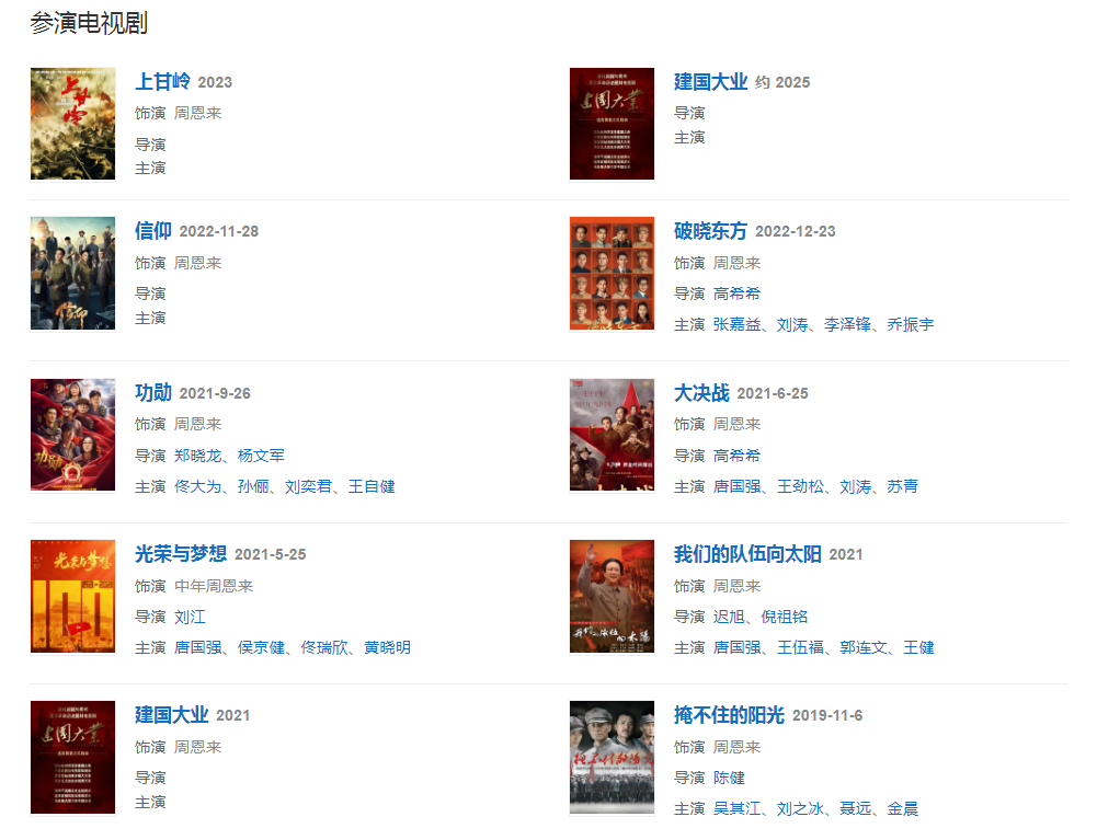 2000年主演電視劇《長征》,并且憑借其飾演的“周恩來”一角獲北京“電視劇輝煌30年”經(jīng)典熒屏形象獎(jiǎng)。
