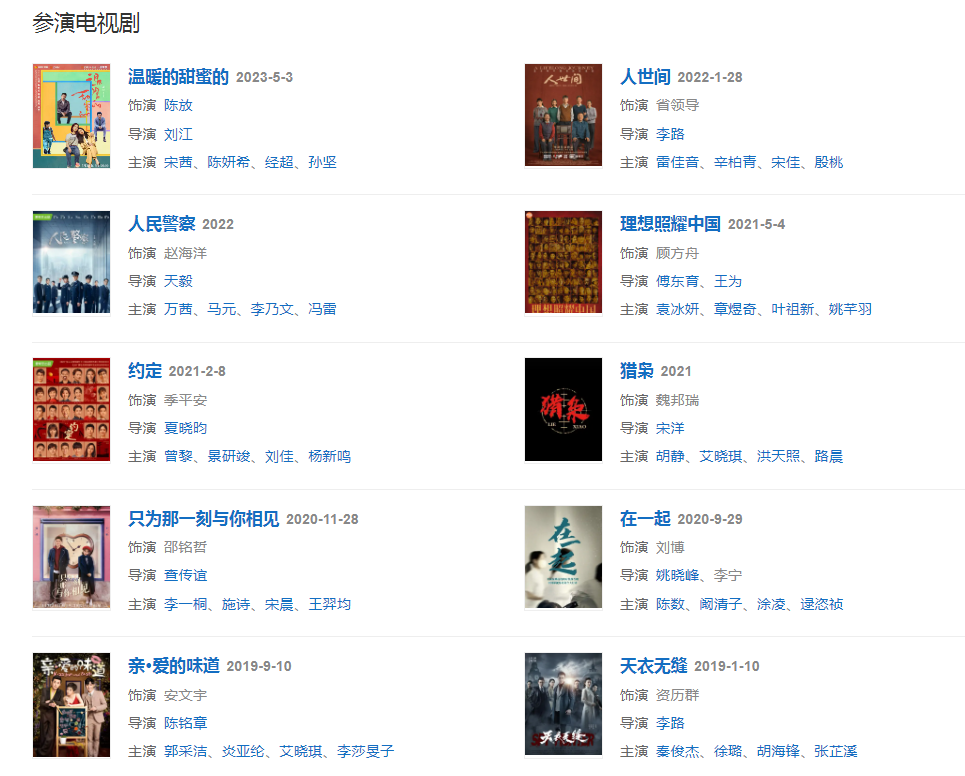 代表作品:永不瞑目、人民的名義、三國、男才女貌、長大、夜幕下的哈爾濱、蘇東坡、假如生活欺騙了你