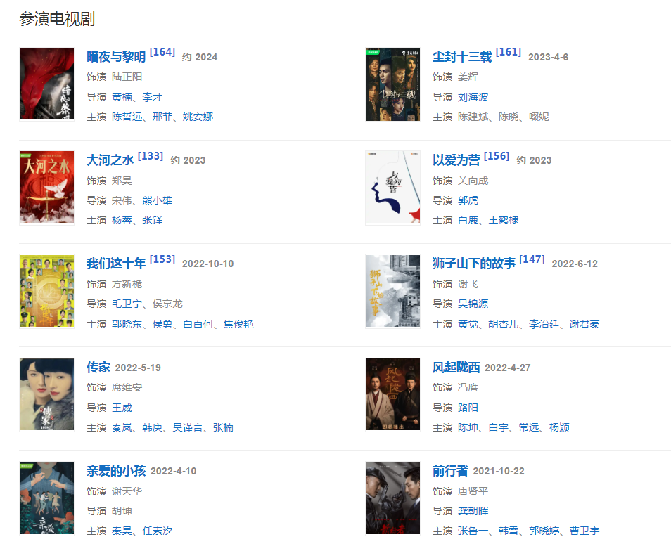 2022年4月10日,與秦昊、任素汐主演的家庭情感劇《親愛的小孩》播出;4月27日,主演的古裝諜戰(zhàn)劇《風起隴西》播出。5月19日,主演的民國情感劇《傳家》播出。