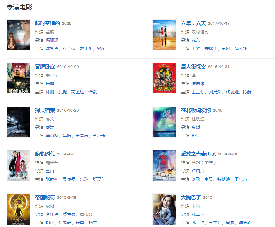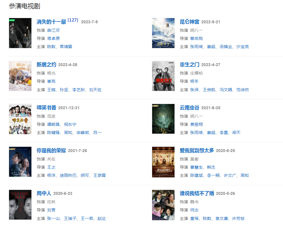 2020年4月1日,搭檔張雨綺、姜超領(lǐng)銜主演的超級(jí)網(wǎng)劇《龍嶺迷窟》在騰訊視頻全網(wǎng)獨(dú)播,劇中扮演胡八一一角。
