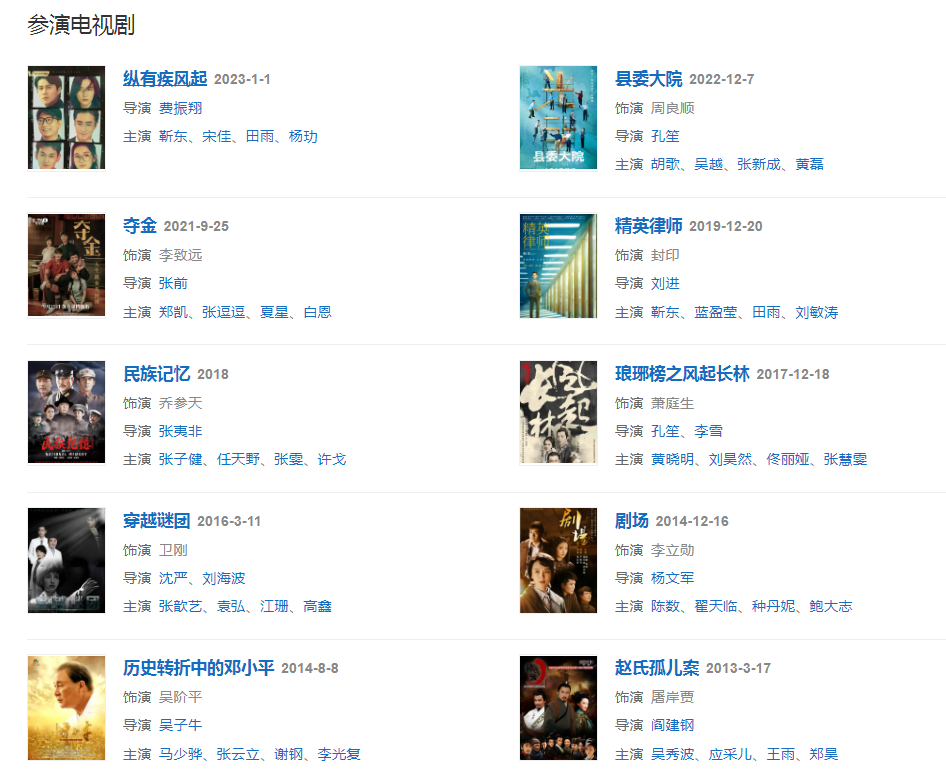 代表作品;走向共和、人間正道是滄桑、幸福來(lái)敲門(mén)、辛亥革命、趙氏孤兒案、瑯琊榜之風(fēng)起長(zhǎng)林、精英律師