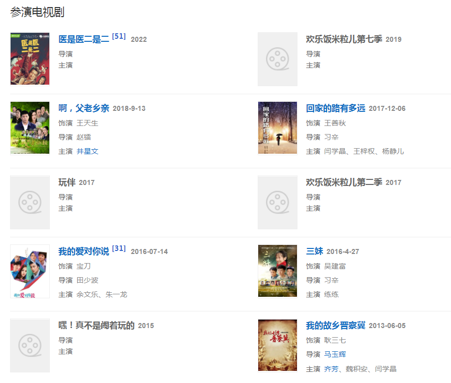 代表作品:當家的女人、你攤上事兒了、吉祥三保、我的故鄉(xiāng)晉察冀、大宋提刑官2、我和丈母娘的十年戰(zhàn)爭