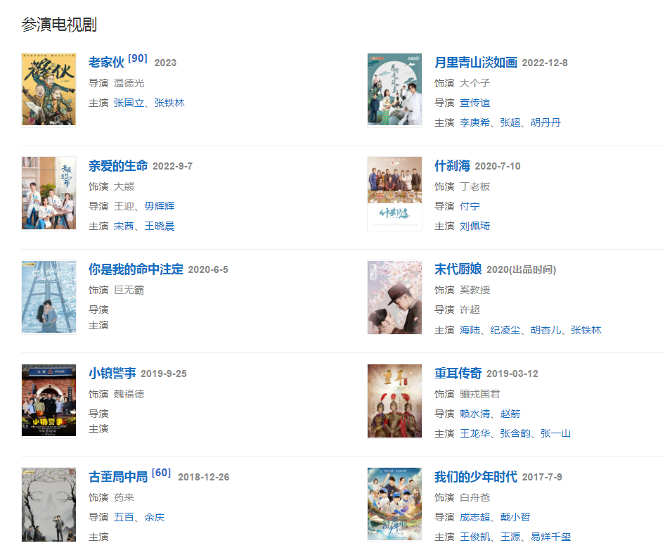 代表作品:夜幕下的哈爾濱、家宴、鐵齒銅牙紀曉嵐、江山風雨情、夢斷紫禁城、鐵將軍阿貴、宰相劉羅鍋