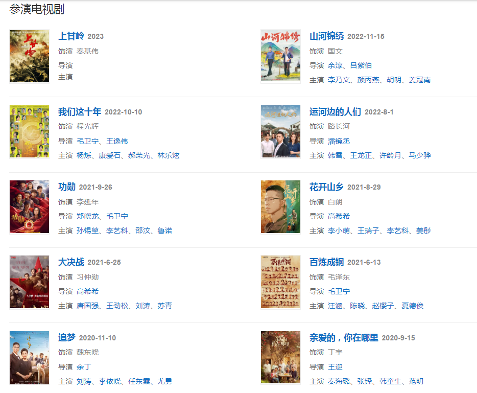 2021年,主演的現(xiàn)代農(nóng)村劇《花開山鄉(xiāng)》和電視劇《功勛》相繼播出。