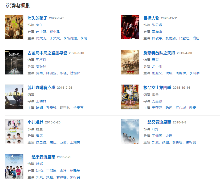 代表作品:少年游、破曉、千方百計(jì)、帽子戲法、花開(kāi)那年、分身情人、瘋?cè)嗽?、封面戀人、旅程、我為自己代言、一起?lái)看流星雨、鐵道英雄、古董局中局之鑒墨尋瓷、反恐特戰(zhàn)隊(duì)之天狼、八佰、冰河追兇、匆匆那年