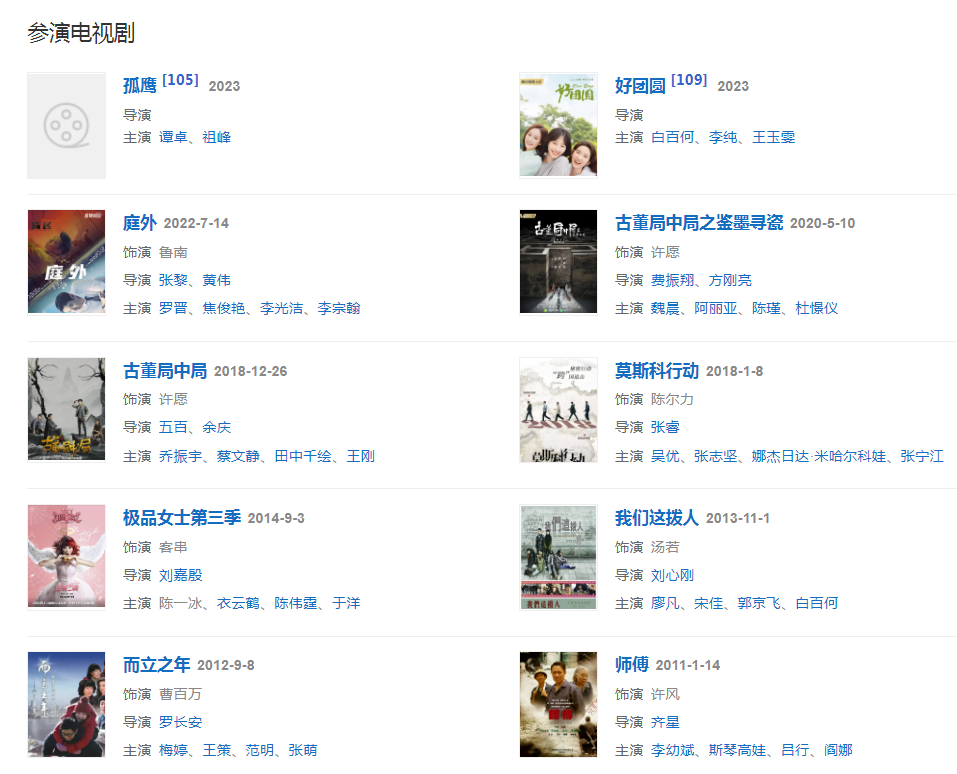 代表作品:陽(yáng)光燦爛的日子、獨(dú)自等待、警察有約、西洋鏡、電影往事、圣誕玫瑰