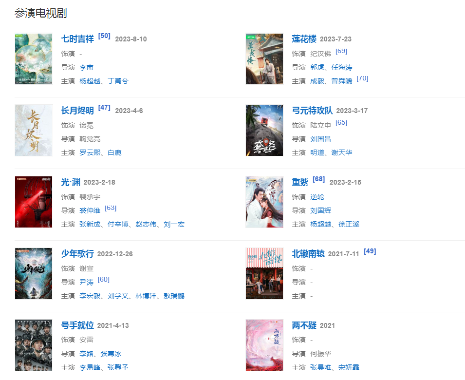 代表作品:水月洞天、蕭十一郎、忠烈楊家將、新步步驚心、軒轅大帝、號手就位、最后的法師