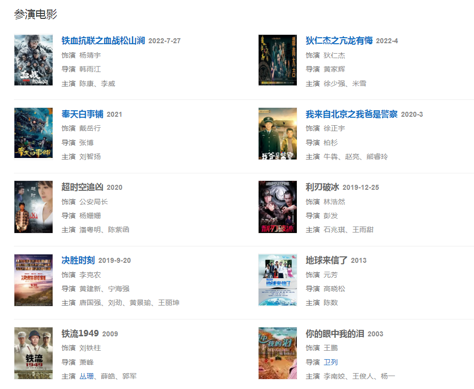 代表作品:甘十九妹、神探狄仁杰、獵鷹1949、飛虎神鷹、石敢當(dāng)之雄峙天東、津門飛鷹