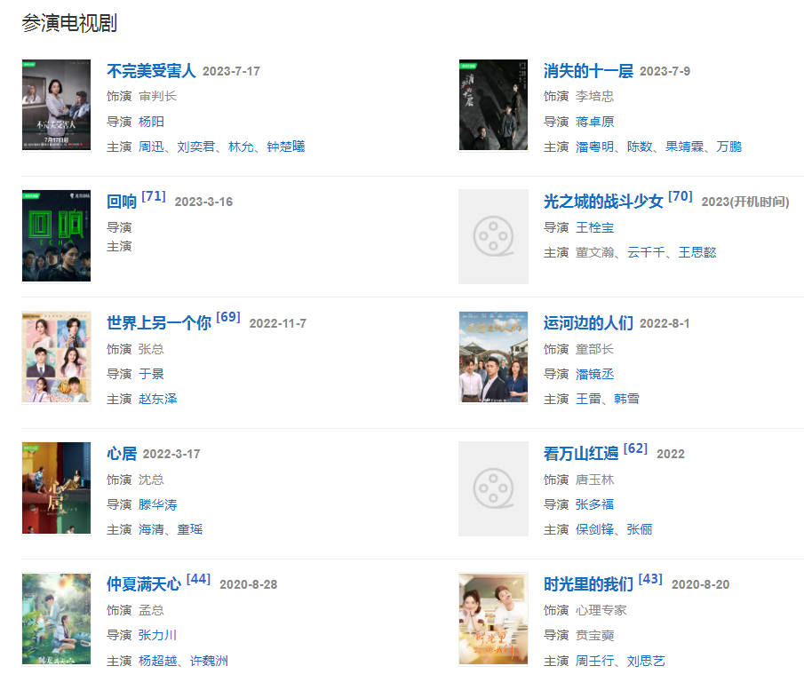 代表作品:人民的名義、北京愛情故事、無懈可擊之高手如林、老大的幸福、青河絕戀