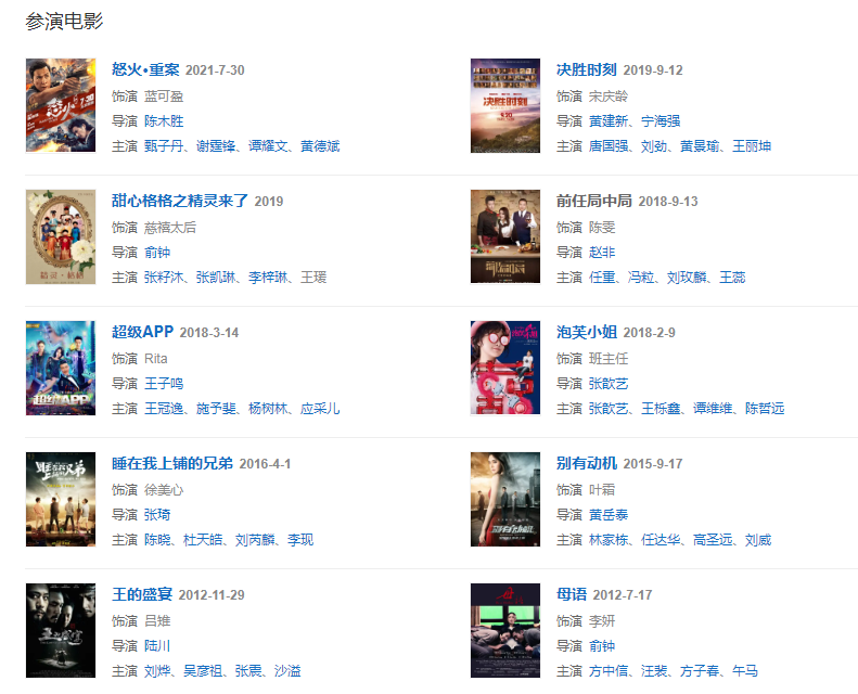 代表作品:還珠格格第三部:天上人間、又見一簾幽夢(mèng)、延禧攻略、怪你過分美麗、大唐女將樊梨花、深宅、一肩之隔、繡娘蘭馨、母語、王的盛宴