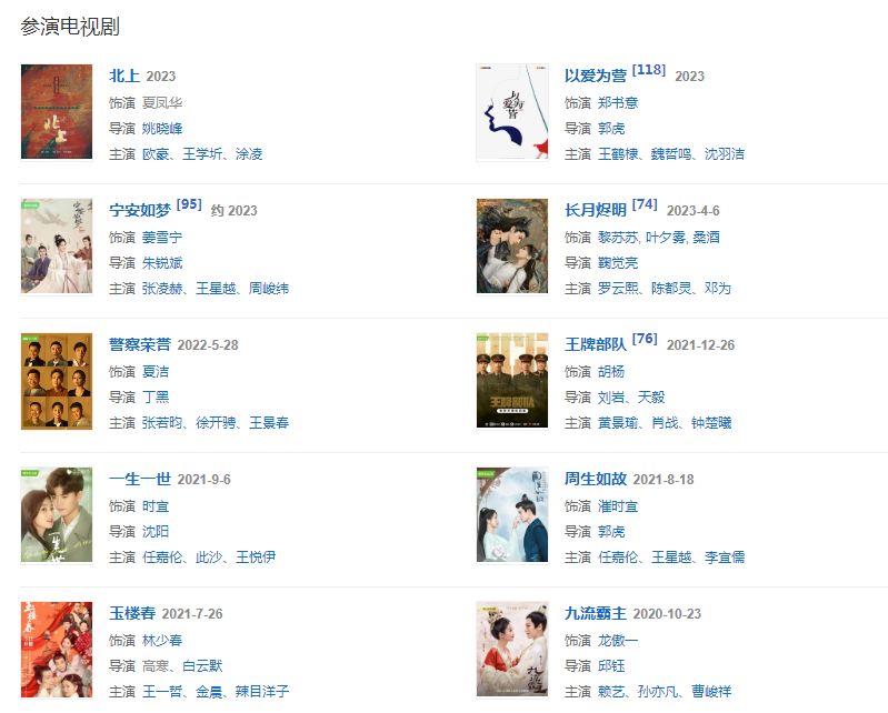 2021年,主演古裝輕喜劇《玉樓春》;同年,主演的古裝劇《周生如故》和電視劇《一生一世》相繼在愛(ài)奇藝播出。