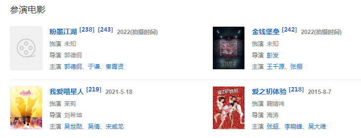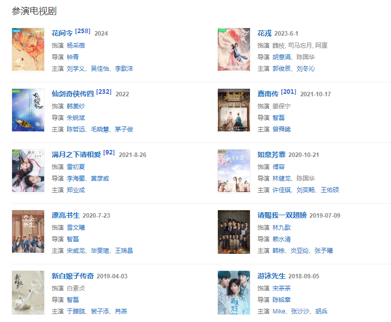 代表作品:蕓汐傳、新白娘子傳奇、請賜我一雙翅膀、如意芳霏、漂亮書生、熱血長安、花戎