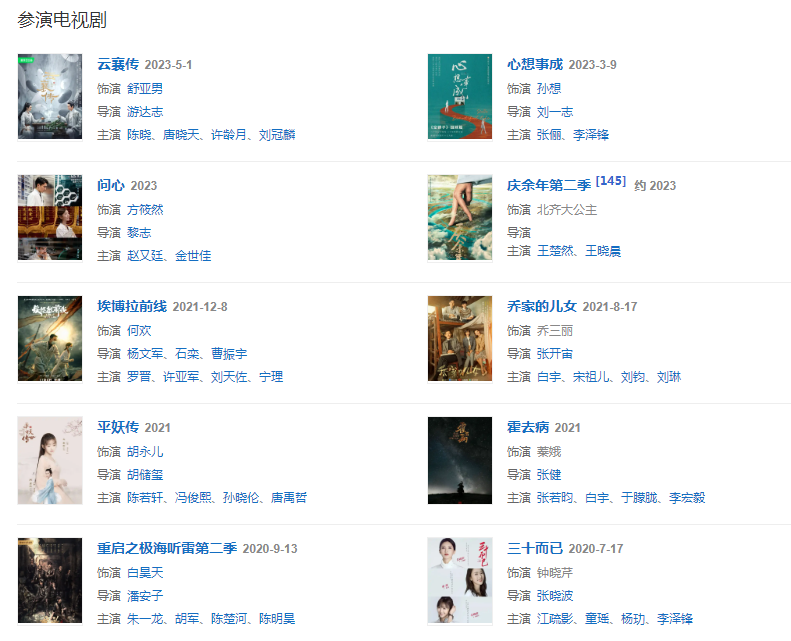 代表作品:三十而已、重啟之極海聽(tīng)雷、甄嬛傳、天涯明月刀、微微一笑很傾城、錦繡未央、刀客家族的女人、喬家的兒女、重啟之極海聽(tīng)雷
