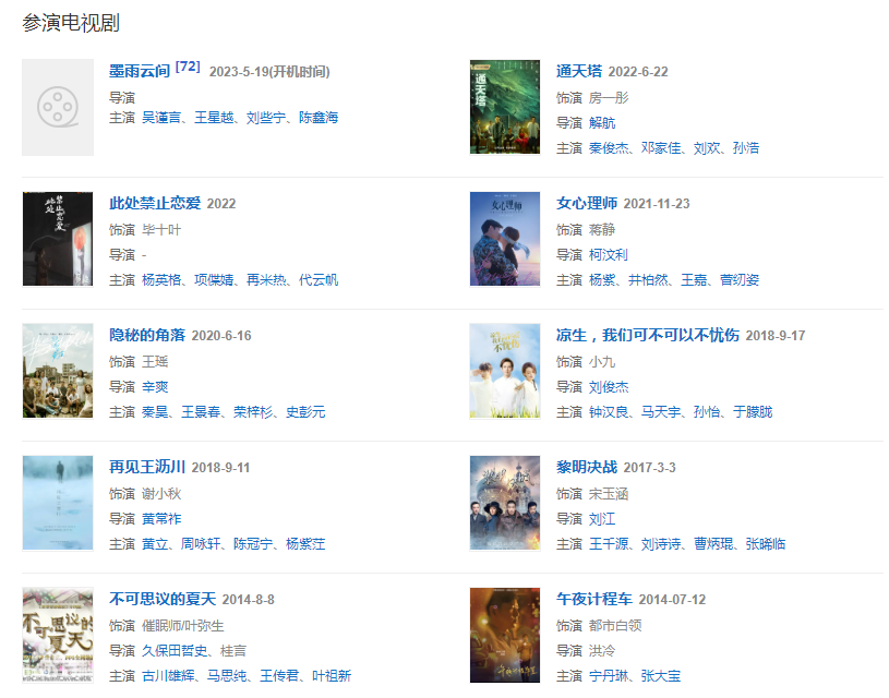 2015年起,相繼拍攝警匪片《解救吾先生》;同年,拍攝青春片《致青春·原來(lái)你還在這里》、《萬(wàn)物生長(zhǎng)》、《夏天19歲的肖像》中塑造了多個(gè)性格迥異的少女形象,靈氣十足、個(gè)性執(zhí)著也成為其突出的銀幕標(biāo)簽。 。