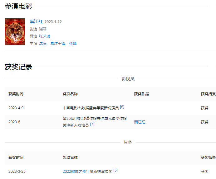 2023年1月22日,王佳怡與沈騰、易烊千璽等人共同主演的張藝謀電影作品《滿江紅》上映,其在片中飾演的瑤琴表面上為柔媚的舞姬,實(shí)則是背負(fù)國(guó)仇家恨的朱顏死士,而這也是她的首部電影作品。