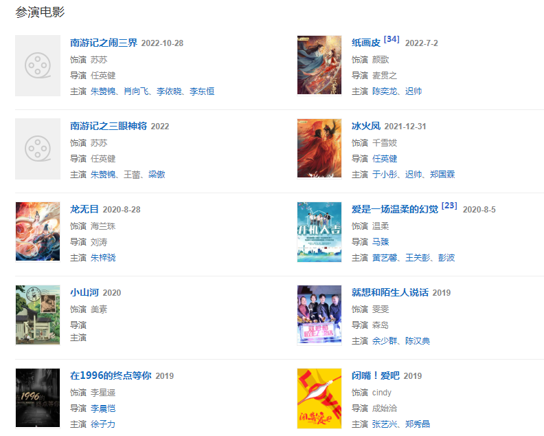 2022年,主演電影《南游記之三眼神將》;7月2日,主演的電影《紙畫(huà)皮》播出;10月28日,主演的古裝玄幻愛(ài)情電影《南游記之鬧三界》在騰訊視頻上線(xiàn),在片中飾演仙女蘇蘇。
