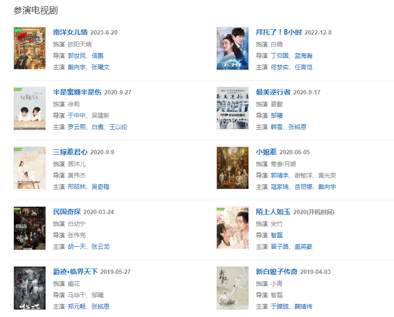 代表作品:小娘惹、新白娘子傳奇、民國奇探、招搖、飄香劍雨、燃血女神