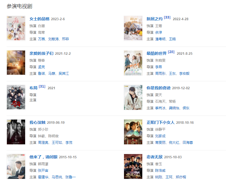 2018年,在蔣雯麗、倪大紅主演的年代情感劇《正陽門下小女人》中飾演多愁善感的徐家二女兒徐靜平。